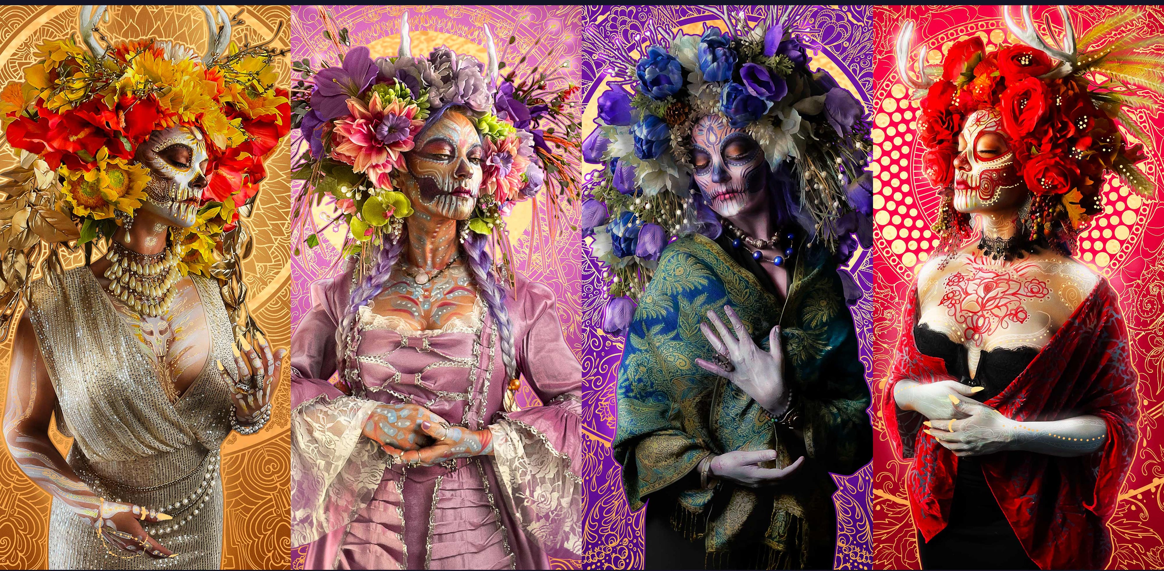 This Day of the Dead series of foil embellished self-portraits honors my mother’s memory through her favorite flowers, Hungarian Folk motifs blended with the art of sugar skulls, and the jewelry she left me.
