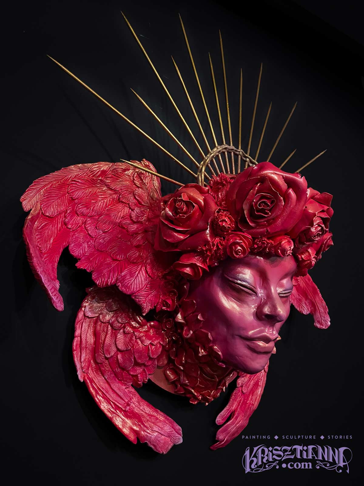This larger piece is supported by wood and screw frames, reinforced and sculpted with Apoxie for stability. Armature was built up with Apoxie clay, plaster, and wood, then refined through carving, sanding, and cutting. Surface detail additionally incorporates air-dry clays and porcelain, which allow for precision and fine texture. This work was painted with layers of acrylic and airbrush, then sealed to preserve surface and color. Other elements include custom resin hearts that I sculpted and cast myself, as well as integrated lighting and LED wiring, and finished with silk and polyester flowers.